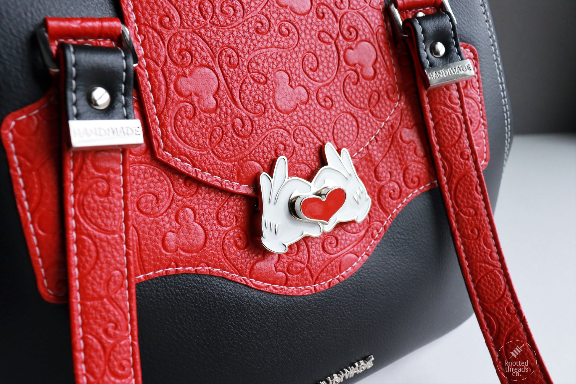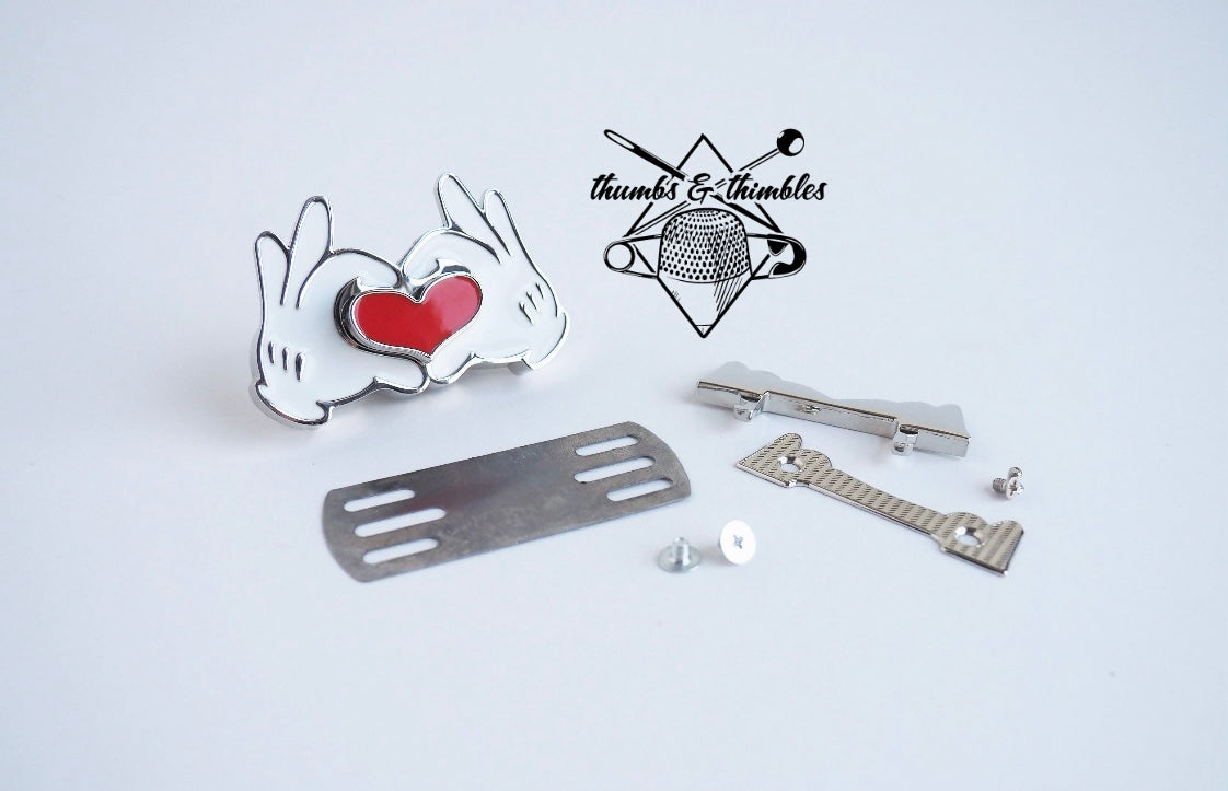 Push-lock is installed by attaching the top end to a flap or bag closure while the bottom half is installed to the front of the panel of a wallet/bag.